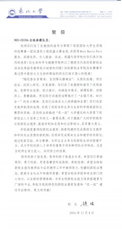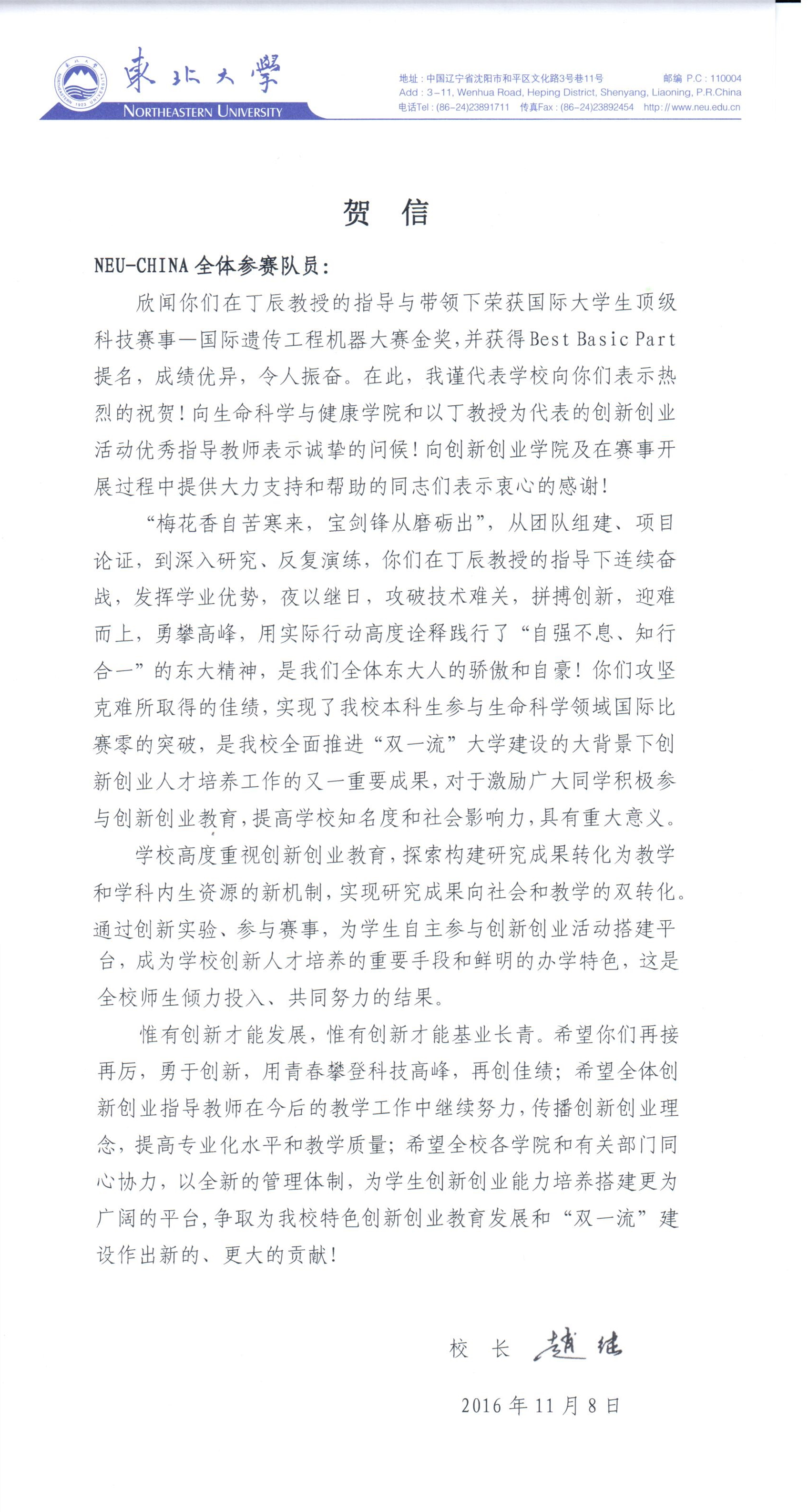 11月8日,东北大学校长赵继为我院参加国际工程机器大赛(iGEM)的“NEU-CHINA”团队成员发来贺信,对他们取得的成绩表示热烈的祝贺,并对在赛事开展过程中付出努力的教师表示诚挚的慰问。