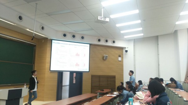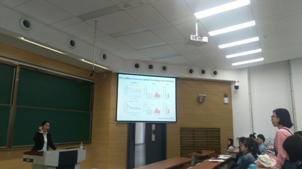 郝爽作了题为“Forniceal deep brain stimulation rescues hippocampal memory in Rett syndrome mice”的学术讲座。她与研究生分享了通过行为学,分子生物学,电生理学等科学方式,分析深层脑部电刺激(Deep brain stimulation, DBS),近红外光治疗(Near-infrared light, NIr)等电学或光学方法,对动物模型的运动及认知功能的作用效果,并探讨了未来生命科学发展趋势。