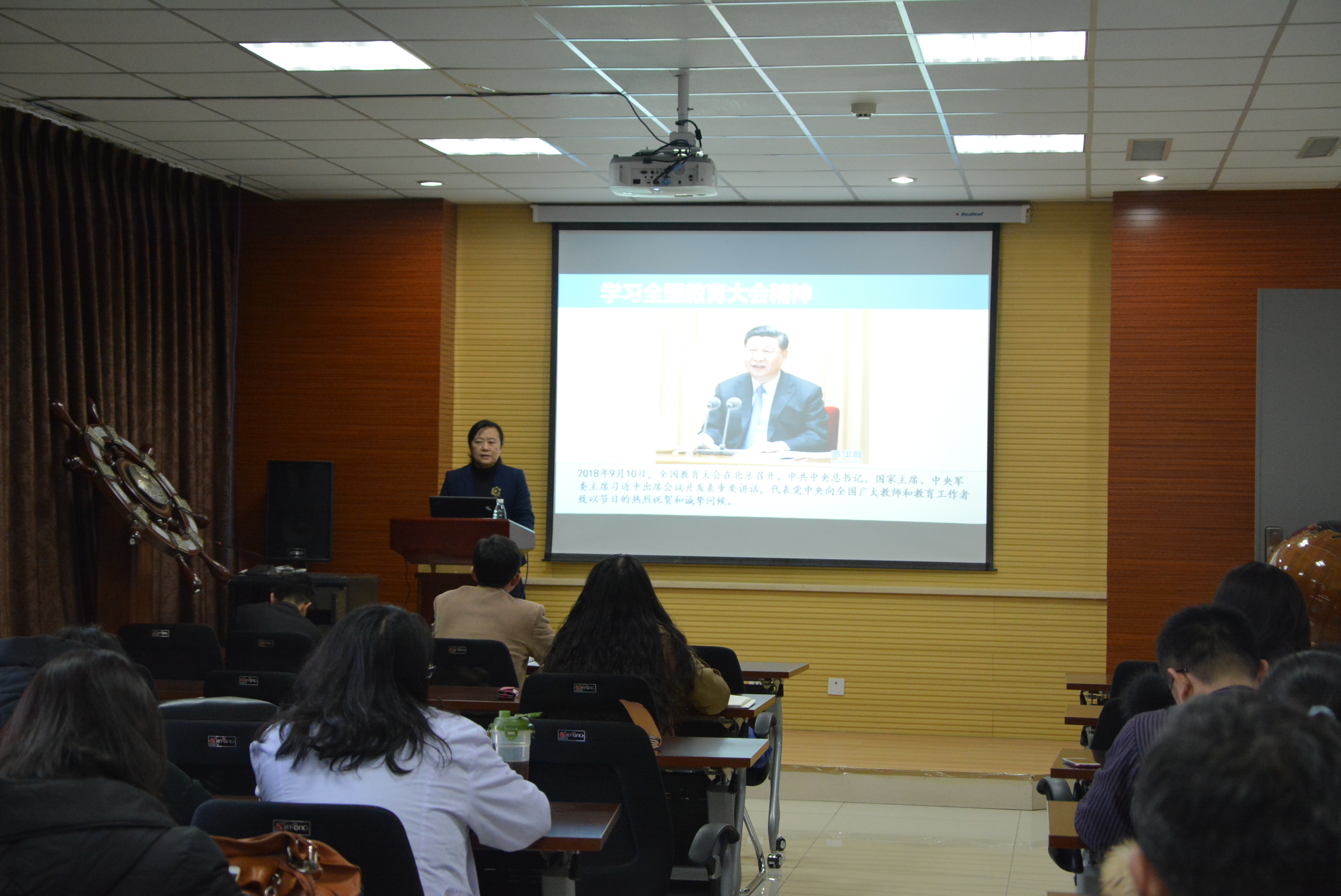 马克思主义学院副教授周莉应邀作了题为《准确把握新时代新形势培养民族复兴的有用之才》的专题报告,周莉结合习近平总书记在全国教育大会上的重要讲话精神,从教育改革发展的新理念新思想新观点以及中国特色社会主义高校根本问题即培养什么人、怎样培养人、为谁培养人等方面做出了详细分析,并就教育部如何落实全国教育大会精神出台的相关文件制度进行了解读,她表示当代教师要坚持中国特色社会主义教育发展道路,把立德树人作为教育工作的主线,当好学生的引路人,培养德智体美劳全面发展的社会主义建设者和接班人。