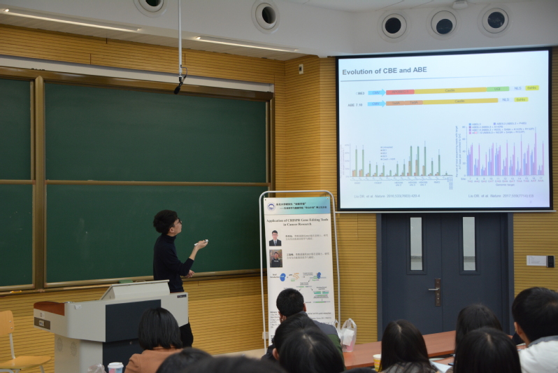 王晓峰的分享主题为CRISPR基因编辑工具在癌症研究中的应用。介绍了常用基因编辑工具CRISPR-Cas9的背景知识,阐述了基因编辑工具的工作原理,及其在癌症研究中的具体应用以及相关研究方法的改进等。李泽旭的分享主题为DNA碱基编辑技术及其在癌症生物学中的应用。系统介绍了肿瘤发生的进程,基因组中产生的遗传变异,DNA碱基编辑技术的应用,以及相关技术平台的构建方法等。两位同学在分享过程期间,参加活动的师生分别针对感兴趣的问题与两名同学进行了学术探讨。