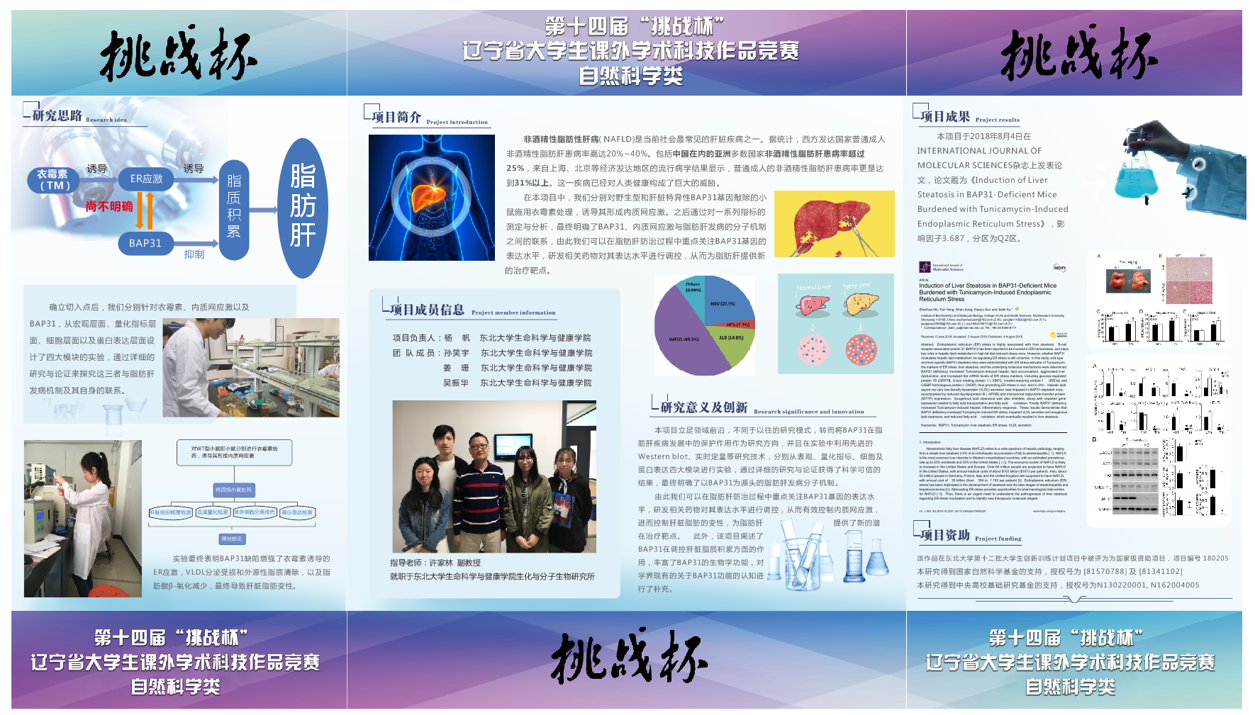 我院教师许家林和4名2016级本科生(吴振华、杨帆、孙笑宇、姜珊)组成团队,进行衣霉素介导的关于脂肪肝发病的分子机制及相关蛋白研究,通过作品展示、作品陈述、评审提问、现场回答等环节,最终脱颖而出,喜获特等奖。