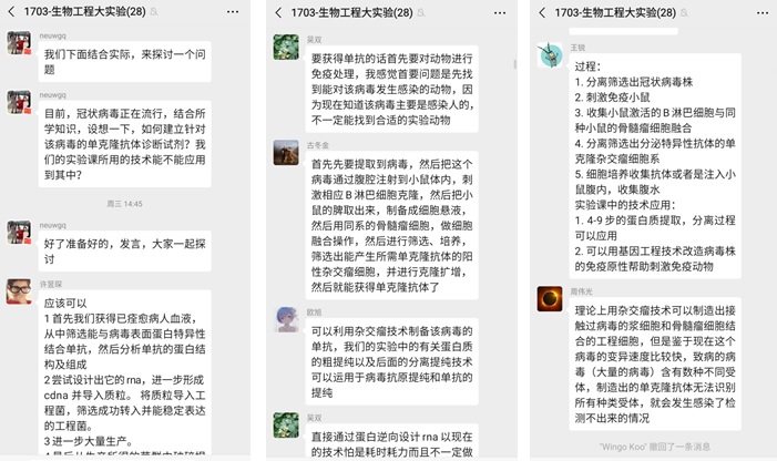 生物工程大实验的授课教师王国卿结合新时期冠状病毒的热点问题,指导学生利用所学的实验技术与方法,从抗原抗体的角度进行实验设计,从理论层面探讨建立针对该病毒单克隆抗体的诊断试剂,引起了学生们热烈的讨论及深入思考,为学生返校后开展线下实验教学做好理论保障,同时深入培养学生在生物大实验中思考问题、探究问题的各项能力。