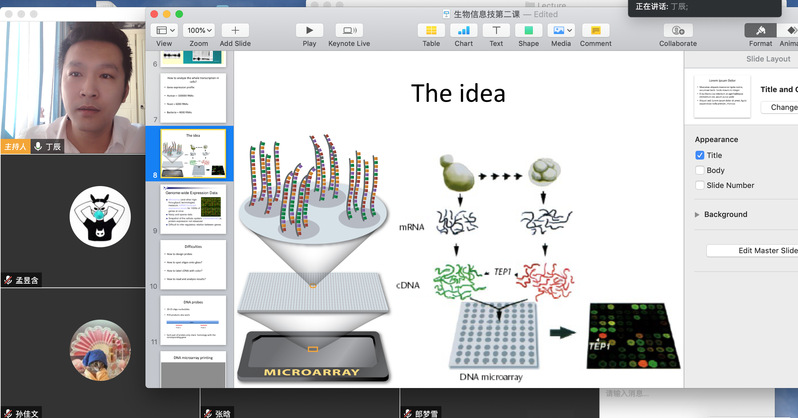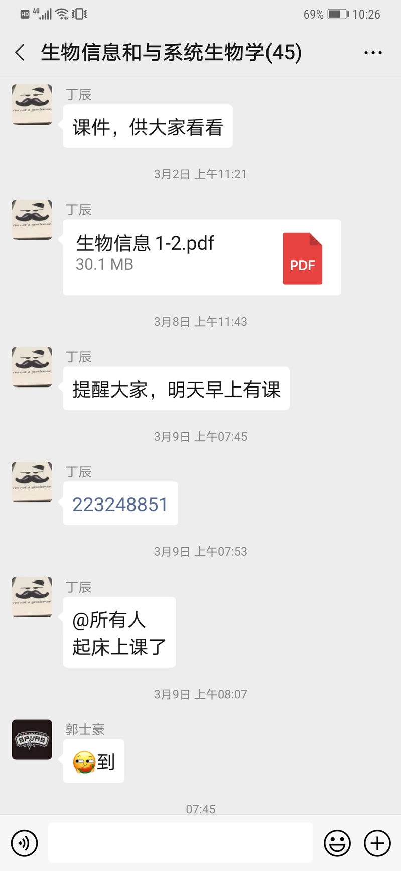 沈祥波同学:丁老师的授课方式非常适合我们,他根据课程内容能够重点突出、层次分明,清晰讲解实例帮助我们理解,实时在线演示,非常有助于学生在家查阅文献,老师教学认真,上课有时非常幽默,提起大家的兴趣,活跃课堂气氛,注意启发和调动我们的积极性,对学生提出的问题有问必答,学习生物信息与系统生物学这门课受益良多,感谢丁老师的辛苦付出。