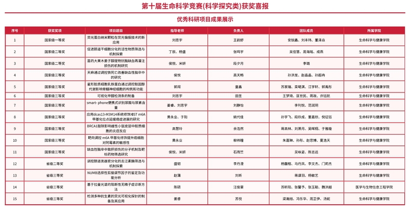 其中,生命科学与健康学院刘思宇副教授指导项目获得国家级一等奖、三等奖,丁辰教授、杨盛老师指导项目获得国家级二等奖,侯悦教授、米妍老师指导项目获得国家二等奖、三等奖,郭闯教授指导项目获得国家级三等奖,黄永业副教授、于阳老师指导项目获得国家级三等奖,姜睿老师、刘思宇副教授指导项目获得国家级三等奖,侯悦教授指导项目获得国家级三等奖,高慧玲副教授指导项目获得国家级三等奖,黄永业副教授指导项目获得国家级三等奖。